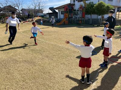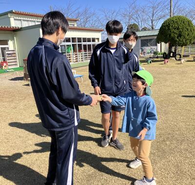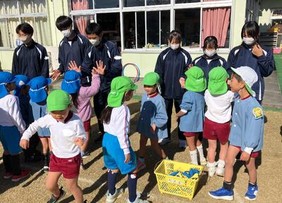 11月19日(水)、袋井高校から、8人のお兄さんとお姉さんが遊びにきてくれました。室内では、折り紙や積み木やブロック遊び、自然物遊びを、園庭では、しっぽ取りやかくれんぼ、リレーや砂遊びなどで一緒に遊びました。優しく関わってくれたのですぐに親しみをもち、子ども達からも声を掛けて遊ぶことを楽しむ姿がたくさん見られました。二時間はあっという間に過ぎ、園児からも高校生からも、「楽しかった!」という声が多く聞かれました。