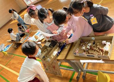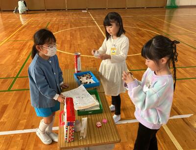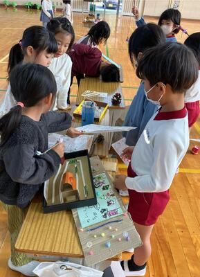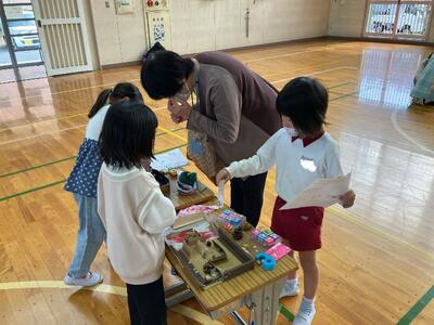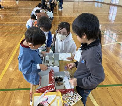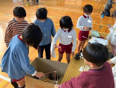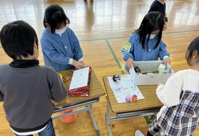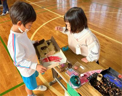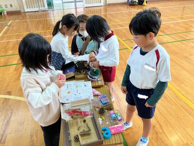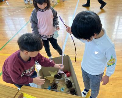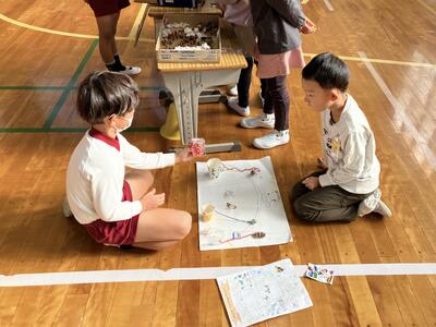 12月2日(火)、今井小学校の一年生の「キラキラ秋ランド」に遊びに行かせてもらいました。秋の自然物を使ってどんぐりごまや迷路・すごろく・けん玉・釣りなど、一年生が考えて作った遊びを楽しむ中で、「これ面白い!」「魚釣れたよ!」「ゴールまで行けた!」「楽しい!」「色々なものがあって、すごい!」と、時間いっぱいまで遊んでも遊び足りないくらい、あっという間の時間でした。
