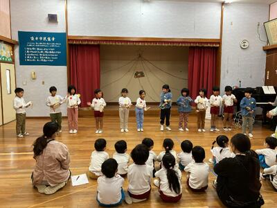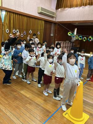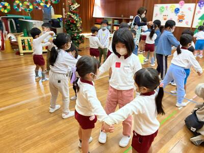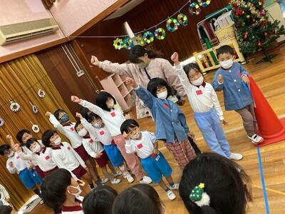 お楽しみ会当日は、クリスマスの由来を聞いたり、ダンスや楽器遊びをしたりしてクリスマスコンサートを楽しみました。「クリスマスツリーゲーム」では、サンタチームとトナカイチームに分かれて、ツリー作りをしました。先生とジャンケンして勝つことができると、嬉しそうにツリーに飾りを付けていました。ツリーはサンタチームが早く完成しましたが、どちらのチームも応援し合いながら、楽しむことができました。