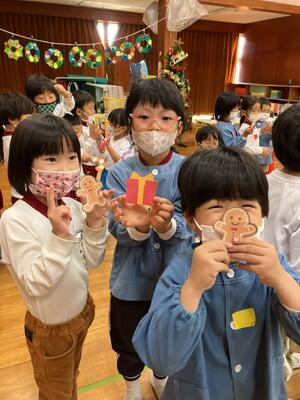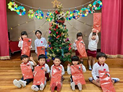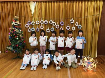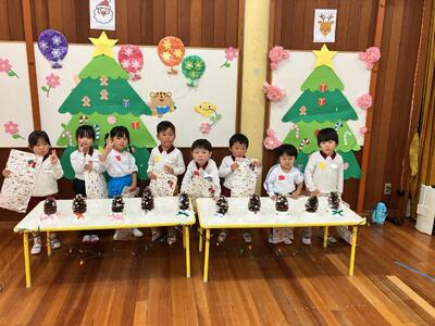 12月17日に「お楽しみ会」を行いました。お楽しみ会に向けて、年長児は毛糸のリース、年中児は折り紙リース、年少児はまつぼっくりツリーを作りました。また、「あわてんぼうのサンタクロース」を歌ったり、「うさぎ野原のクリスマス」のダンスをみんなで踊ったりして、子どもたちは会を楽しみにしていました。