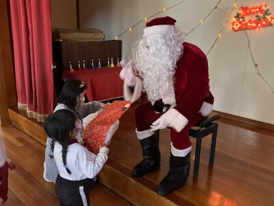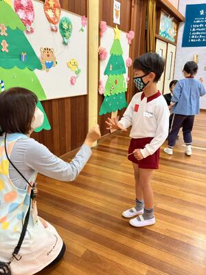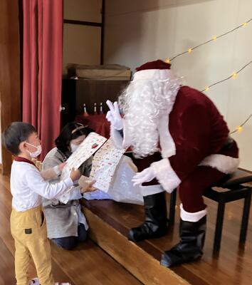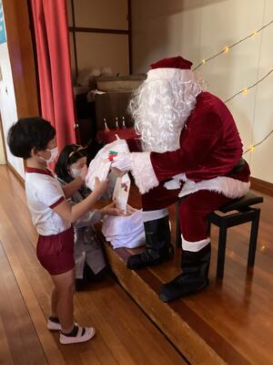 「何歳なの?」「好きな食べ物は何?」「どうやって世界中の子にプレゼントを渡すの?」と、先生が質問をして、サンタさんが話をすると、子どもたちは興味をもって聞いていました。サンタさんからプレゼントをもらった子どもたちは「Thank you!」とお礼を言い、「何が入っているのかな?」とワクワクしながら大事そうに持っていました。サンタさんに「ありがとう」の気持ちを込めて、みんなで「^あわてんぼうのサンタクロース」の歌をプレゼントすると、歌に合わせてサンタさんが踊ってくれて、子どもたちはとても嬉しそうでした。サンタさんに会えた余韻に浸り、「おうちにも来てくれるかな?」「サンタさんにまた会いたいな」と話しながらクリスマスを心待ちにしている子どもたちでした。