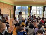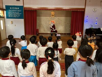 リンリンリン♪ どこからか鈴の音が聞こえ、「メリークリスマス!」とサンタさんが来てくれました。「え!サンタさん!」「幼稚園に来てくれた!」とサンタさんを見る子どもの目はとても輝いていました。