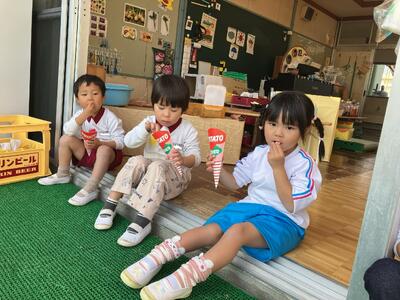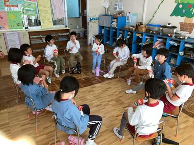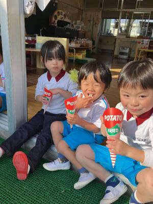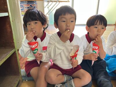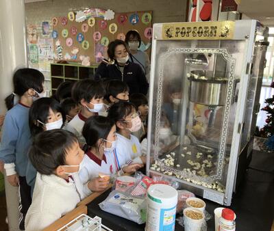会終了後もお楽しみはまだまだ続きます!地域の方から紙オルゴールとポップコーンメーカーをお借りし、紙オルゴールの演奏を聴いて楽しんだり、ポップコーンができる様子を間近で見ることができ、「ポン!って音が鳴ったよ」「膨らんでたくさん出てきた!」と興味をもって話をしていました。「おいしいね」と友達と言い合いながら食べ、おかわりをする子も多くいました。たくさんの「楽しい」を経験した1日となりました。