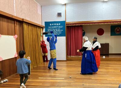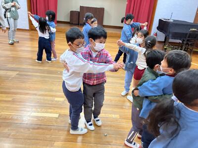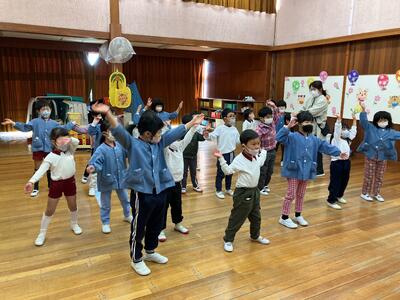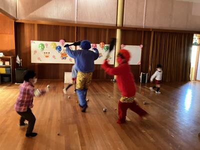 異年齢で楽しんでいた「赤鬼と青鬼のタンゴ」のダンスを踊ったり、「まめまき」の歌も歌ったりしました。