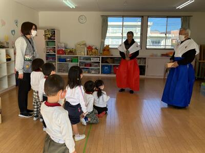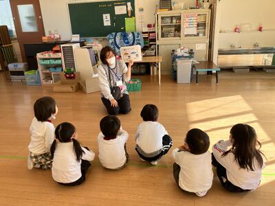 遊戯室に集まり、節分の由来や恵方巻等の縁起の良い節分の食べ物について話を聞きました。