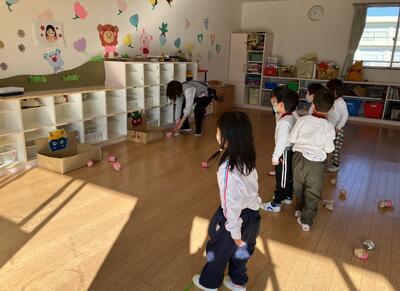 節分クイズを行う時に、クイズのレベルに合わせて年少児は預かり保育室へ、年中長児は遊戯室に分かれました。