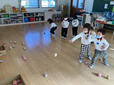 鬼に追いかけられたり、捕まりそうになったりする子もいましたが、「鬼は外!」「福は内!」と大きな声で自分たちが作った豆を投げる姿が見られました。