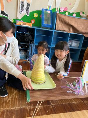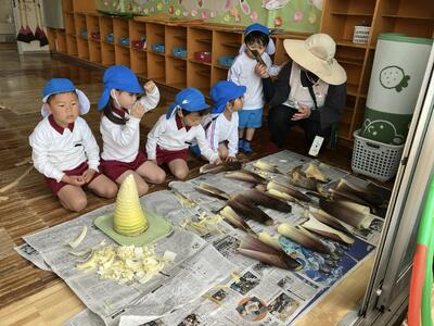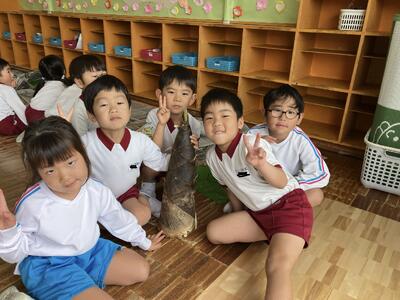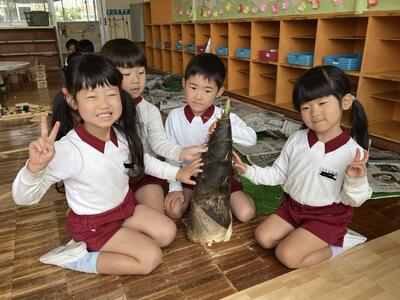 先日、地域の方が大きなタケノコを幼稚園に持ってきてくれました。子どもたちは「とっても大きなタケノコだね」「重いよ!!」と驚いていました。