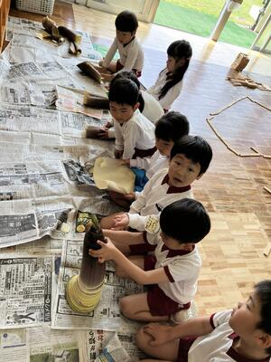 「洋服たくさん着てるね」と皮が付いていることに興味をもった年長児のみんな。「調べてみよう!」と、皮剥きを楽しみました。「まだまだむけるよ!」「何枚あるのかな?」と皮がたくさん剥けることに興味津々でした。「皮の中(内側)はツルツルしてるね」「柔らかい皮もある」と感触にも興味をもっていました。数を数えると、40枚皮が付いていて、皆驚いていていました。剥いた皮やツルツルになったタケノコを年少児、年中児も興味をもって触ることができました。